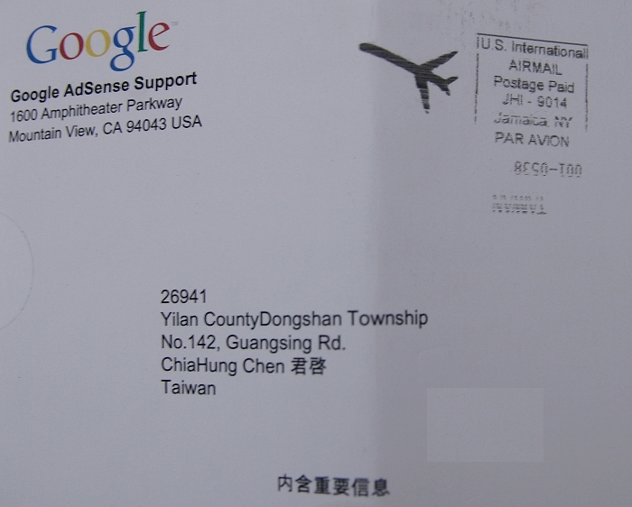 終於在八月初的時後有收到了吶!若是一直沒收到的話,我的Google AdSense帳號大概就要先被鎖住不用了了吧?第一次收到外國寄來的郵件,還滿特別的呀!而且還中、英文都有,只是中文是簡體字就是了。